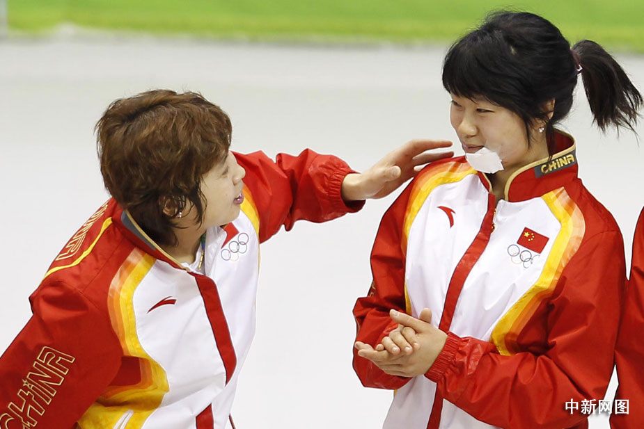 領(lǐng)獎(jiǎng)臺(tái)上,王濛不時(shí)與張會(huì)說話,并用手指比劃著什么。中國隊(duì)領(lǐng)隊(duì)楊占武透露,張會(huì)受的只是皮外傷,沒有大的問題。