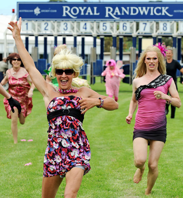 當(dāng)?shù)貢r間2月26日,澳大利亞悉尼,眾多同性戀們濃妝艷抹在皇家賽馬場舉行賽跑,迎接即將到來的悉尼同性戀大游行。