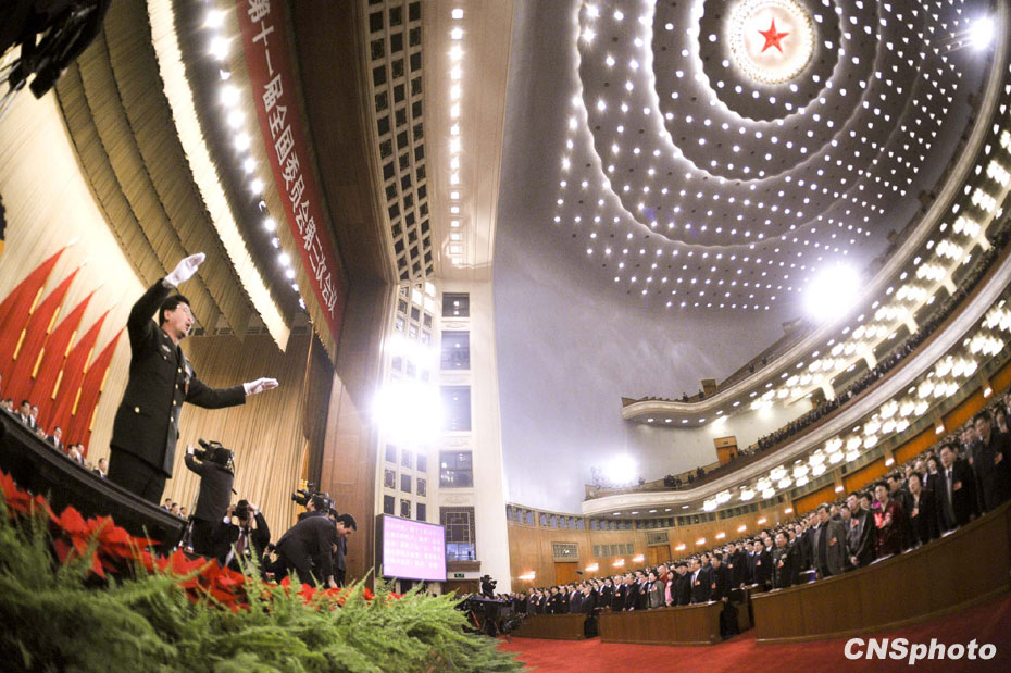 3月3日下午,全國政協(xié)十一屆三次會議在北京人民大會堂開幕,會議開始時全體委員高唱國歌。中新社發(fā) 廖攀 攝