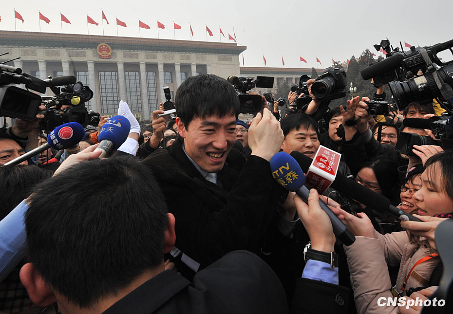 3月3日下午,政協(xié)委員劉翔出席全國(guó)政協(xié)十一屆三次會(huì)議開幕式,在北京人民大會(huì)堂外被媒體重重包圍,艱難脫身。中新社發(fā) 賈國(guó)榮 攝
