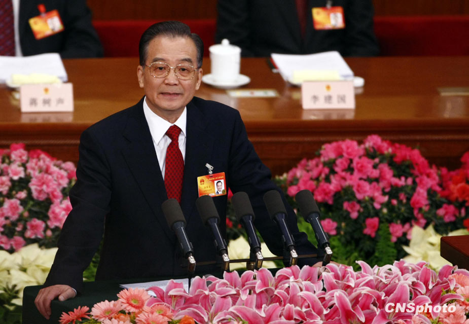 3月5日上午9時,十一屆全國人大三次會議在北京隆重開幕。國務(wù)院總理溫家寶作政府工作報告。圖片來源:中國新聞網(wǎng)