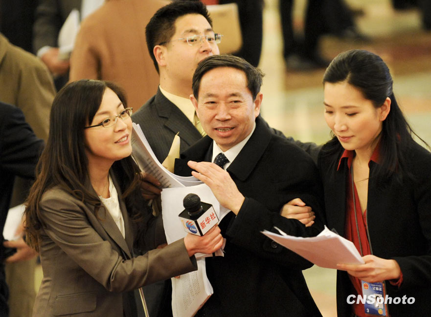 3月5日上午9時,十一屆全國人大三次會議在北京隆重開幕。國務(wù)院總理溫家寶作政府工作報(bào)告。圖為教育部長袁貴仁進(jìn)場時受到記者爭相采訪。中新社發(fā) 廖攀 攝