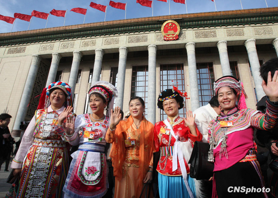 3月5日上午9時,十一屆全國人大三次會議在北京隆重開幕。國務(wù)院總理溫家寶作政府工作報告。圖為少數(shù)民族女代表盛裝出席人大開幕會。 中新社發(fā) 湯彥俊 攝