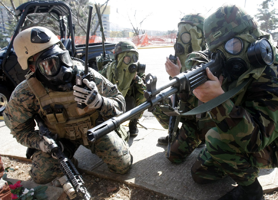 3月11日,在韓國鎮(zhèn)海海軍基地,韓美兩國的海軍陸戰(zhàn)隊(duì)舉行了聯(lián)合反恐軍事演習(xí)。