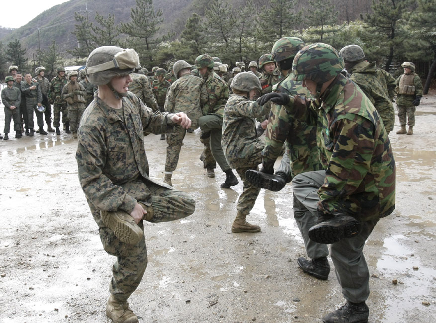 3月11日,在韓國鎮(zhèn)海海軍基地,韓美兩國的海軍陸戰(zhàn)隊舉行了聯(lián)合反恐軍事演習(xí)。