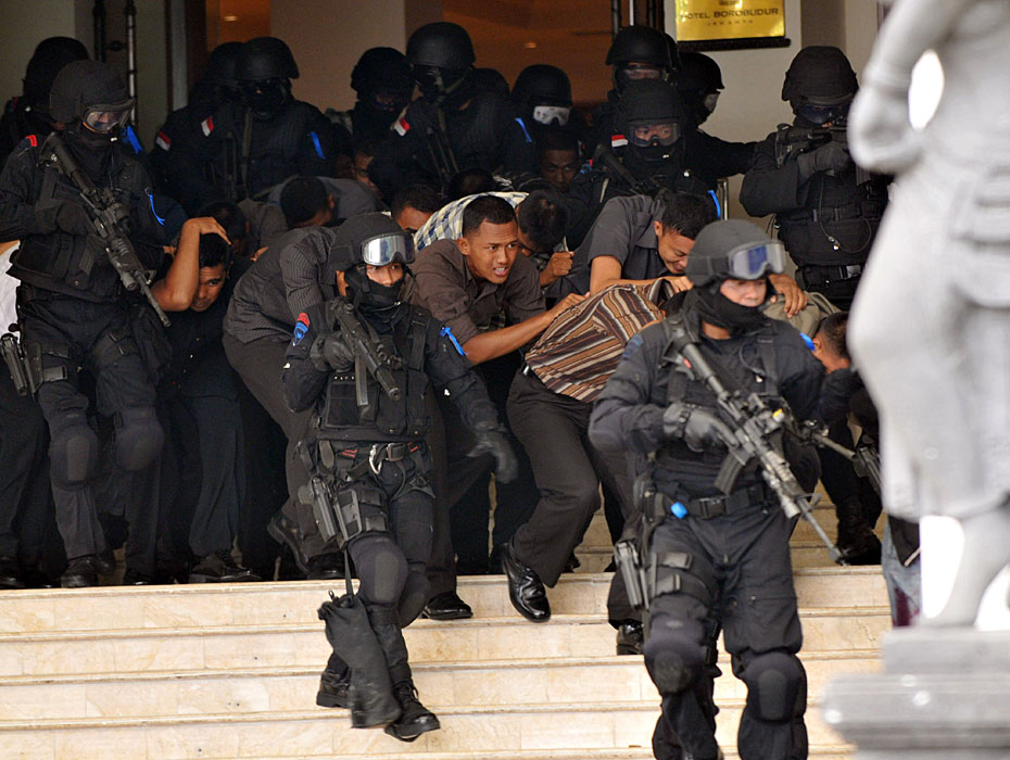 3月13日,印尼警方在首都雅加達(dá)的證券交易所舉行了一場反恐演習(xí),為本月底即將到訪印尼的美國總統(tǒng)奧巴馬創(chuàng)造安全的環(huán)境。圖片來源:中國新聞網(wǎng)