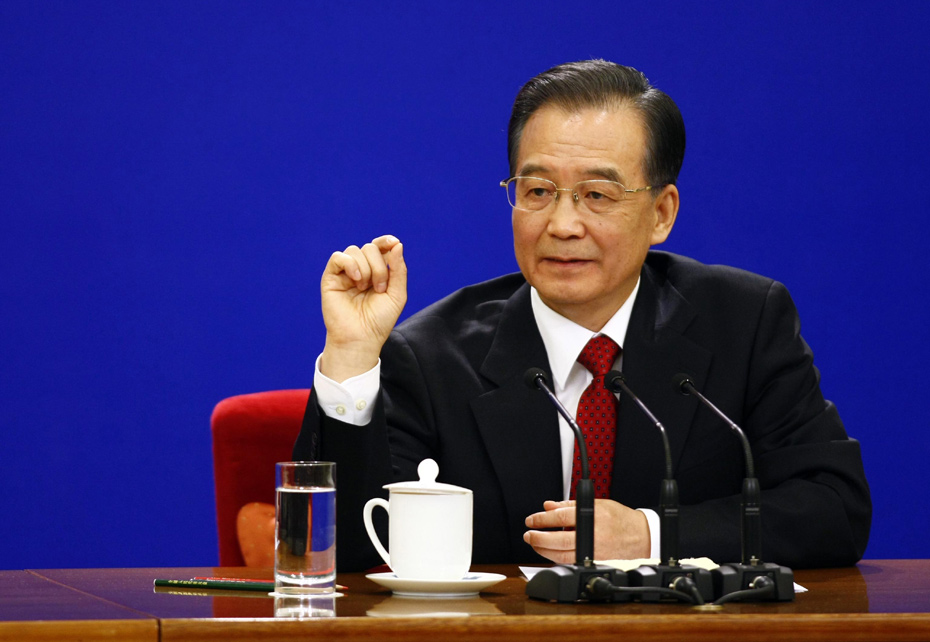 3月14日上午,國務(wù)院總理溫家寶在人民大會堂三樓金色大廳與采訪十一屆全國人大三次會議的中外記者見面并回答記者提出的問題。中新社記者 杜洋 攝 圖片來源:中國新聞網(wǎng)