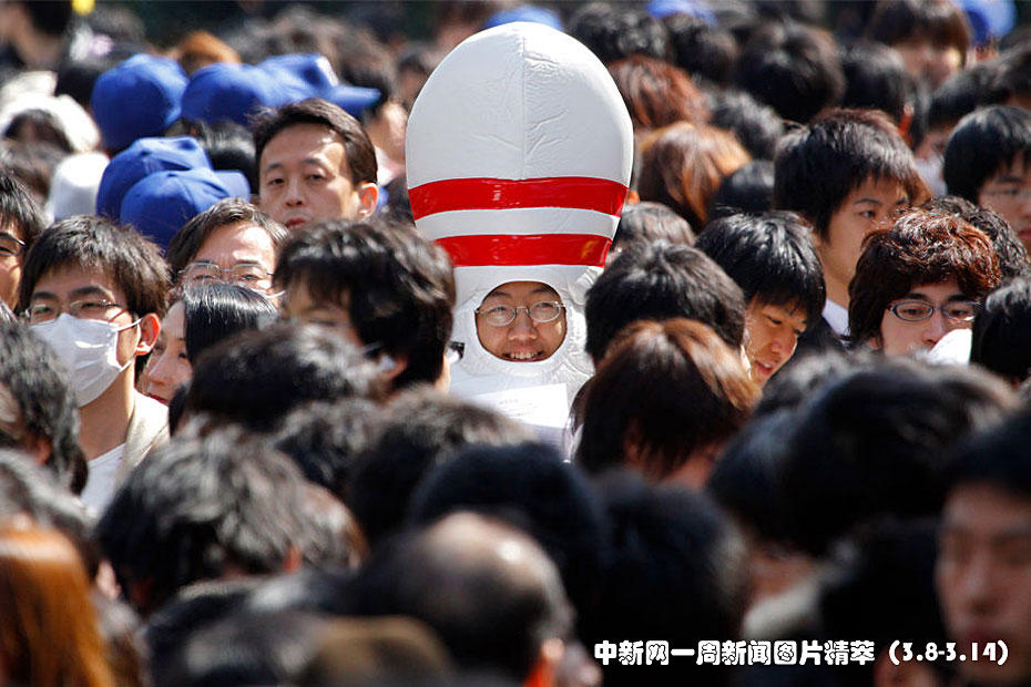 周三,日本東京大學(xué)校園里,一名學(xué)生裝扮成保齡球瓶的樣子。當(dāng)天,這所日本最富盛名的大學(xué)放榜,眾多考生前往查榜。圖片來(lái)源:中國(guó)新聞網(wǎng)
