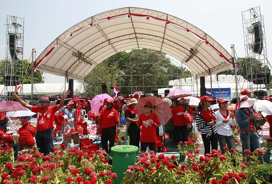 3月13日起,泰國“紅衫軍”陸續(xù)從泰國北部、東北部等外府進(jìn)入曼谷市,在集會(huì)主會(huì)場搭設(shè)演講舞臺(tái)和帳篷,拉開大規(guī)模示威序幕。圖片來源:中國新聞網(wǎng)