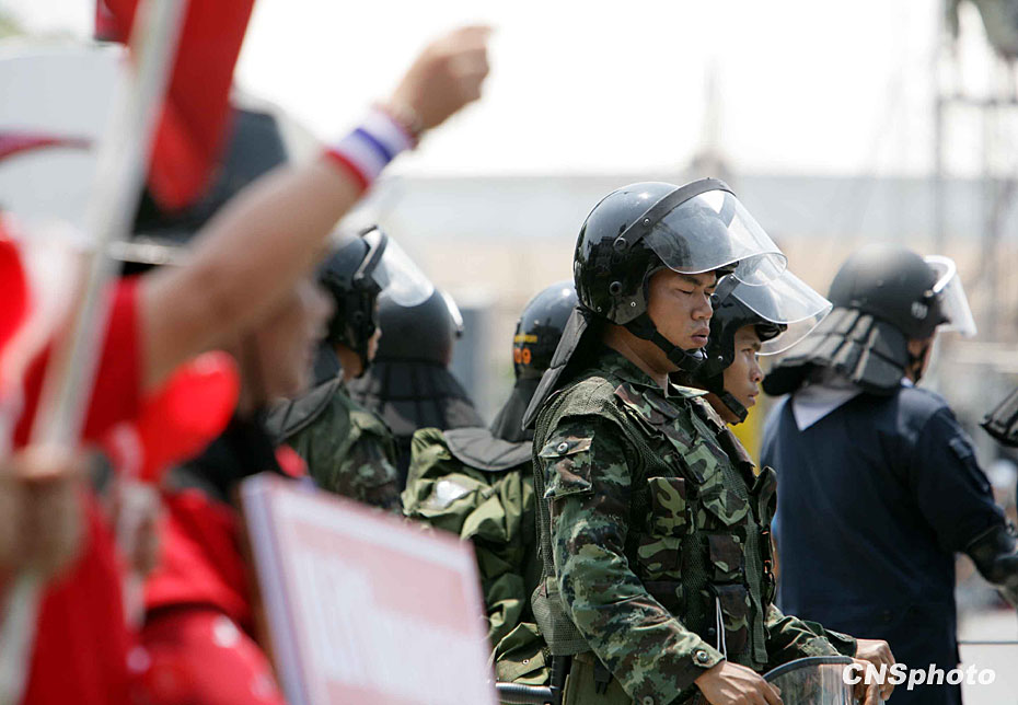 3月13日起,泰國“紅衫軍”陸續(xù)從泰國北部、東北部等外府進入曼谷市,在集會主會場搭設(shè)演講舞臺和帳篷,拉開大規(guī)模示威序幕。圖片來源:中國新聞網(wǎng)