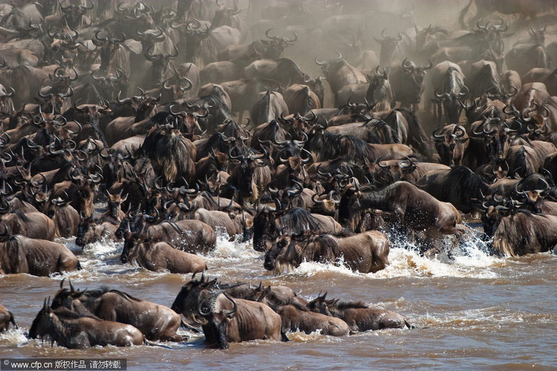 3月17日消息,捷克野生動物攝影師瓦拉夫·希爾哈(Vaclav Silha)在肯尼亞馬賽瑪拉(Masai Mara)國家保護區(qū)拍到了罕見的牛羚大遷移場面。上百萬牛羚集體穿越馬拉河,同時為了防止被水中的鱷魚咬到及逃避岸邊叢林里的老虎,牛羚群制造出巨大的聲響并急沖到對岸。barcroftmedia/CFP