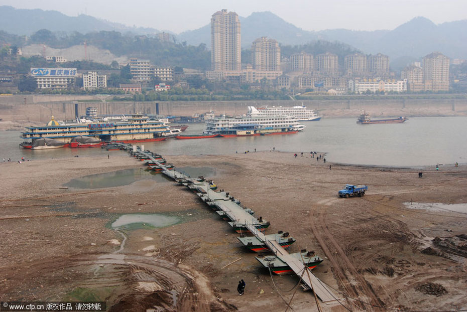 3月13日,長江重慶朝天門段裸露的河灘。受西南地區(qū)干旱和三峽水庫騰庫影響,長江重慶段水位持續(xù)走低,給通航安全帶來影響。劉洋/CFP