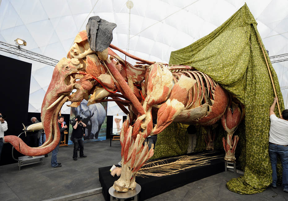德國(guó)著名解剖學(xué)家鞏特爾·馮·哈根斯博士被稱為“死亡先生”,目前展出的是有史以來(lái)的最大的動(dòng)物尸體。體型巨大的“桑芭”尸體高3.5米,重3.2噸。據(jù)悉“桑芭”將于2010年4月歸還諾因基興動(dòng)物園。圖片來(lái)源:中國(guó)新聞網(wǎng)
