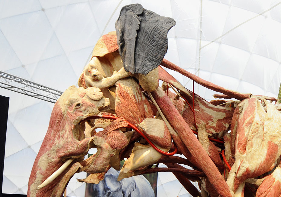 德國著名解剖學家鞏特爾·馮·哈根斯博士被稱為“死亡先生”,目前展出的是有史以來的最大的動物尸體。體型巨大的“桑芭”尸體高3.5米,重3.2噸。據(jù)悉“桑芭”將于2010年4月歸還諾因基興動物園。圖片來源:中國新聞網(wǎng)
