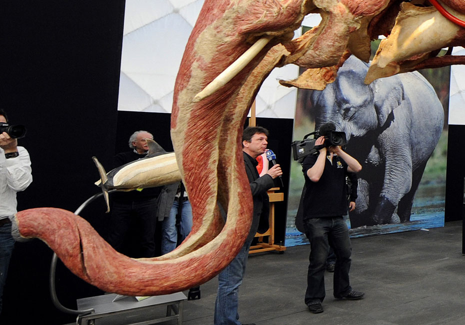 德國著名解剖學(xué)家鞏特爾·馮·哈根斯博士被稱為“死亡先生”,目前展出的是有史以來的最大的動物尸體。體型巨大的“桑芭”尸體高3.5米,重3.2噸。據(jù)悉“桑芭”將于2010年4月歸還諾因基興動物園。圖片來源:中國新聞網(wǎng)