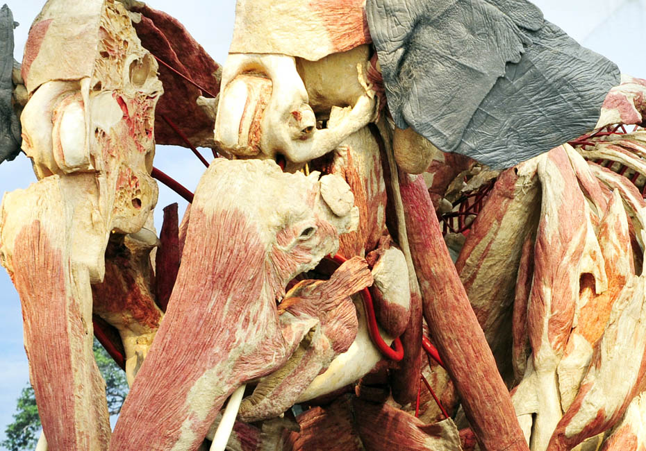 德國著名解剖學家鞏特爾·馮·哈根斯博士被稱為“死亡先生”,目前展出的是有史以來的最大的動物尸體。體型巨大的“桑芭”尸體高3.5米,重3.2噸。據(jù)悉“桑芭”將于2010年4月歸還諾因基興動物園。圖片來源:中國新聞網(wǎng)