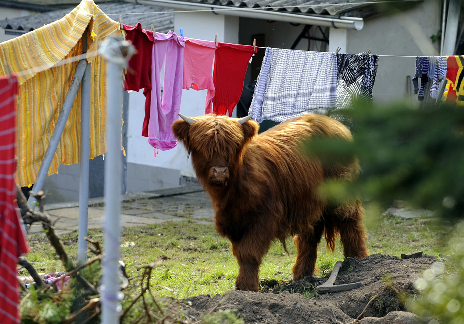 3月18日,德國一頭蘇格蘭高地牛來到一居民院內(nèi)懶洋洋的曬太陽,最后經(jīng)過獸醫(yī)的麻醉和消防員協(xié)力才將這頭蠻力十足的家伙“制服”。圖片來源:中國新聞網(wǎng)