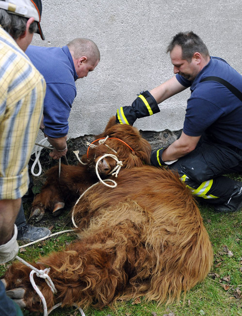 3月18日,德國一頭蘇格蘭高地牛來到一居民院內(nèi)懶洋洋的曬太陽,最后經(jīng)過獸醫(yī)的麻醉和消防員協(xié)力才將這頭蠻力十足的家伙“制服”。圖片來源:中國新聞網(wǎng)