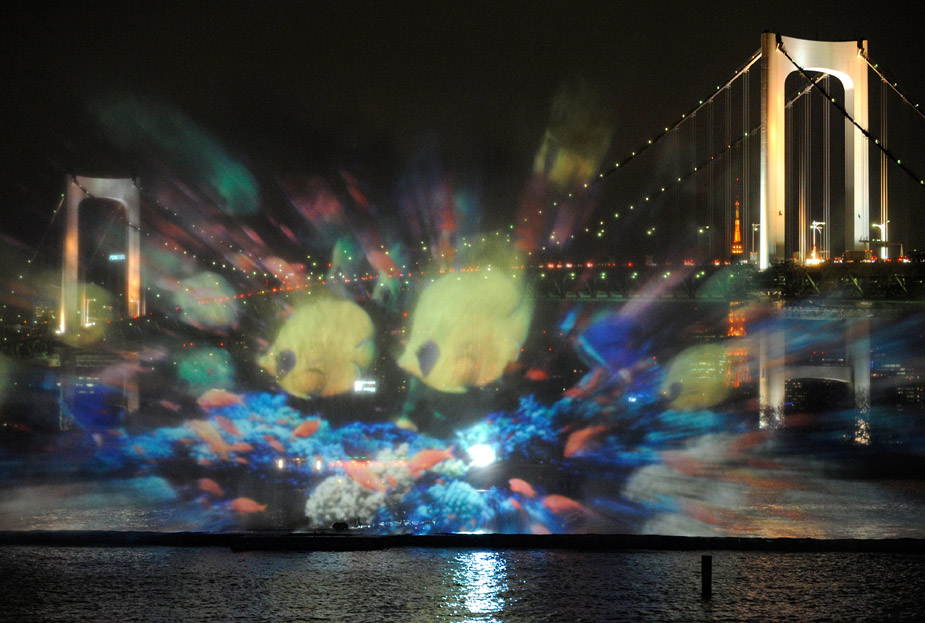 3月19日晚,在日本東京灣上演了一場(chǎng)美輪美奐的“海上幻燈”。東京灣的噴泉噴射出長(zhǎng)60米、高23米的各種海洋生物的畫(huà)面,令人驚嘆。