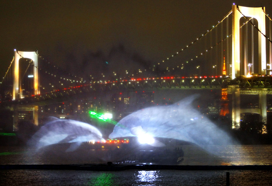 3月19日晚,在日本東京灣上演了一場美輪美奐的“海上幻燈”。東京灣的噴泉噴射出長60米、高23米的各種海洋生物的畫面,令人驚嘆。