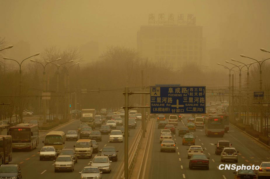 3月20日,春季首場重度浮塵天遮蓋了整個(gè)北京城。圖為北京馬路上空浮塵嚴(yán)重,帶來交通不便。中新社發(fā) 鄒憲 攝