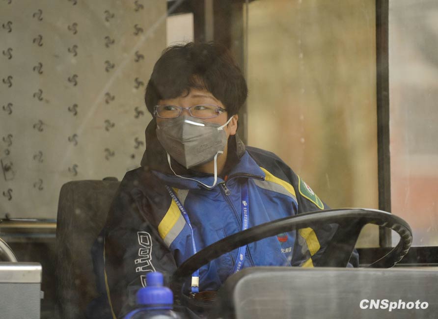 3月20日,春季首場重度浮塵天遮蓋了整個北京城。圖為一位公交車司機(jī)戴上防塵口罩。中新社發(fā) 廖攀 攝