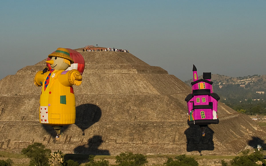 當(dāng)?shù)貢r(shí)間3月21日,熱氣球從墨西哥特奧蒂瓦坎上空飛過。墨西哥近日在特奧蒂瓦坎附近舉行熱氣球節(jié)迎接春分的到來。圖片來源:中國新聞網(wǎng)