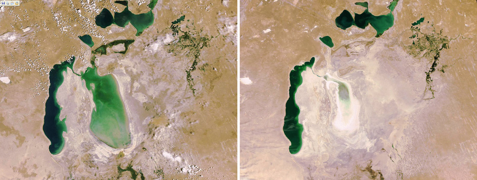 2009年7月10日歐洲航天局公布的照片顯示了號(hào)稱世界第四大內(nèi)陸水體的咸海從06年至09年海岸線急劇回落的過(guò)程。咸海的消失其實(shí)是人類無(wú)度開(kāi)發(fā)利用水資源行為的惡果。