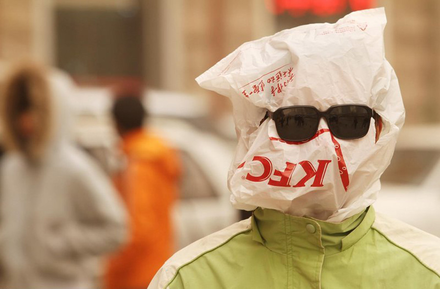 22日上午,在北京馬甸橋附近,一位要體面地去參加面試的小伙子用塑料袋套住腦袋,還戴上墨鏡。