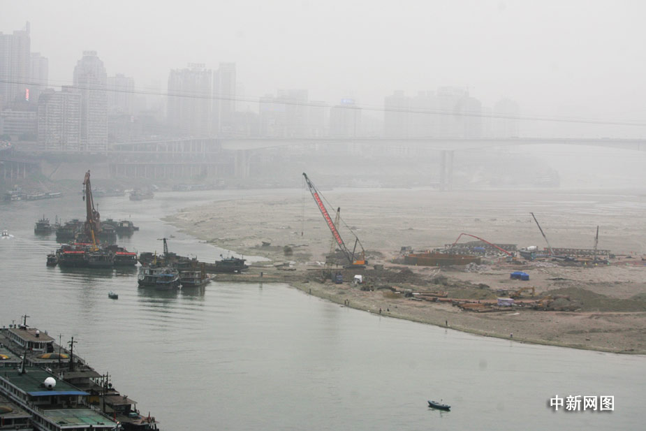 3月23日,重慶市朝天門嘉陵江與長江交匯處大面積河床裸露出來,部分水段已見底。圖片來源:中國新聞網(wǎng)