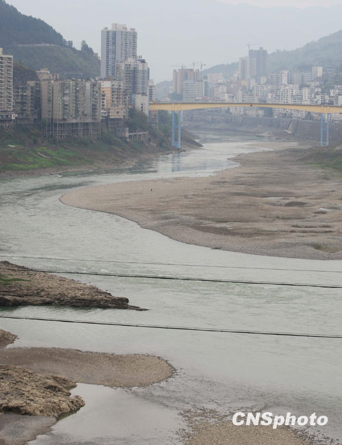 3月23日,重慶市武隆縣境內(nèi)的烏江段河床大面積裸露,河面嚴(yán)重變窄。近段時間以來,受貴州、重慶地區(qū)持續(xù)干旱、來水減少的影響,烏江航道重慶段徑流量較常年減少40%以上,水位平均下降1米左右,船舶在航行過程中多次出現(xiàn)觸礁、擱淺等事故。當(dāng)?shù)胤姥纯购缔k公室透露,目前烏江重慶段已基本斷航,每天均有不少船只?看a頭等待上游的彭水電站調(diào)峰發(fā)電增大烏江水量,以便通過變得狹窄的烏江向下游航行。 中新社發(fā) 郭晉嘉 攝