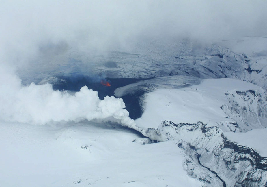 3月21日,冰島首都雷克雅未克東南方向的埃亞菲亞德拉冰蓋冰川,熔巖從火山口噴出。 這座火山于20日午夜前后就開始噴發(fā)。圖片來(lái)源:中國(guó)新聞網(wǎng)