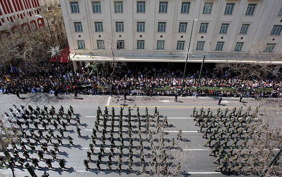 3月25日,在希臘首都雅典的憲法廣場,人們參加獨(dú)立戰(zhàn)爭紀(jì)念日慶;顒。圖片來源:中國新聞網(wǎng)