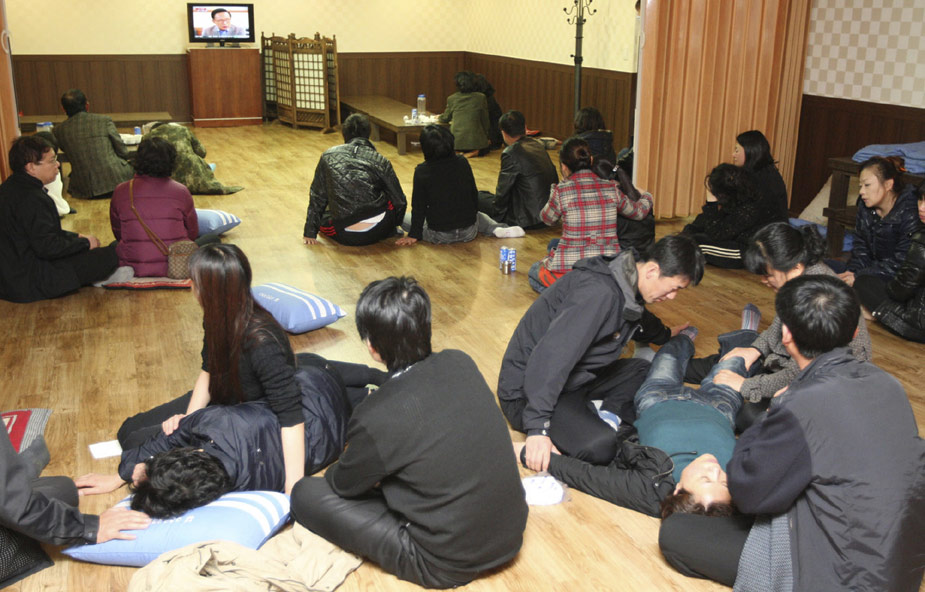 首爾當(dāng)?shù)貢r(shí)間26日晚9點(diǎn)45分許,在韓國(guó)西部海域執(zhí)行警戒任務(wù)的天安艦(1200噸級(jí))因不明原因事故,船底被炸開洞,船尾開始下沉。天安艦上共有104人,韓國(guó)巡邏艇和直升飛機(jī)迅速展開救援行動(dòng),事發(fā)5小時(shí)后,官員稱已救出58人,但因?yàn)閺?qiáng)風(fēng)和夜幕,救援行動(dòng)進(jìn)展緩慢,其它人員仍下落不明。圖為韓國(guó)海軍“天安艦”上士兵的家屬正圍在電視前等待消息。