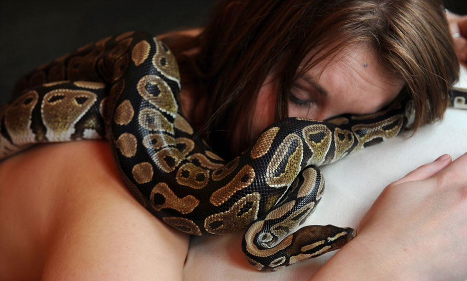 當?shù)貢r間26日,英國一名來自于“切辛頓冒險世界”的女員工為了宣傳位于萊瑟黑德的一家主題公園,擺出姿勢接受兩條黃蟒的“按摩”。