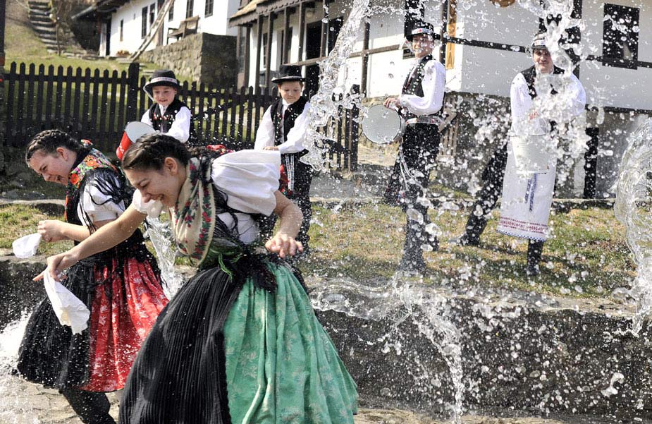3月26日,在匈牙利首都布達佩斯以東被譽為世界文化遺產(chǎn)的霍洛克村,當(dāng)?shù)鼐用褚韵蚬媚锷砩蠞娝膫鹘y(tǒng)儀式慶祝復(fù)活節(jié)。此項古老習(xí)俗起源于公元2世紀(jì)。