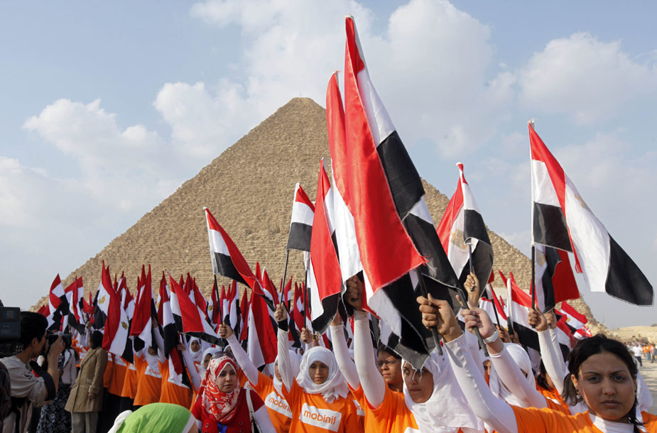 3月26日,4550名埃及兒童在首都開羅市郊的胡夫金字塔前揮舞埃及國旗,創(chuàng)造了在同一地點(diǎn)集體揮舞國旗的吉尼斯世界紀(jì)錄。