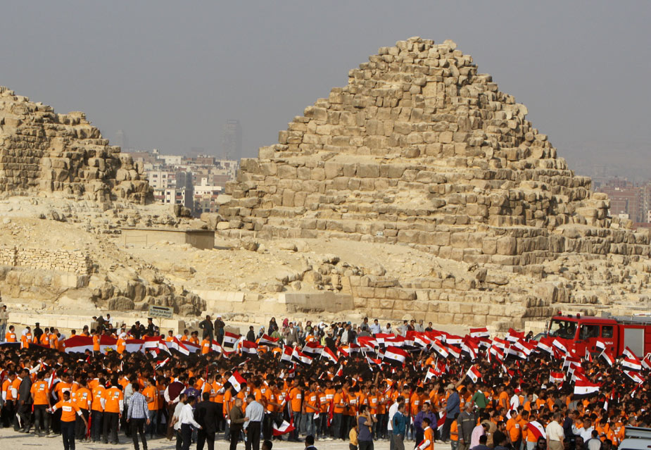 3月26日,4550名埃及兒童在首都開羅市郊的胡夫金字塔前揮舞埃及國旗,創(chuàng)造了在同一地點(diǎn)集體揮舞國旗的吉尼斯世界紀(jì)錄。