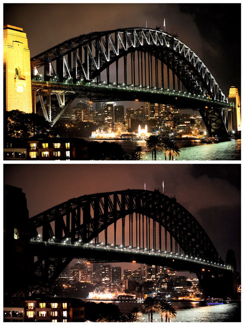 由世界自然基金會(huì)發(fā)起的“地球一小時(shí)”環(huán);顒(dòng)27日20點(diǎn)30分按照時(shí)區(qū)依次在全球數(shù)千個(gè)城市展開。圖為澳大利亞悉尼港大橋在熄燈前和熄燈后的景色。