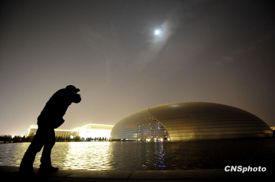3月27日20點(diǎn)30分,北京國家大劇院關(guān)閉外景燈光,參與全球“關(guān)燈一小時(shí)”活動(dòng)。圖為記者關(guān)注熄燈后的國家大劇院。中新社發(fā) 廖攀 攝
