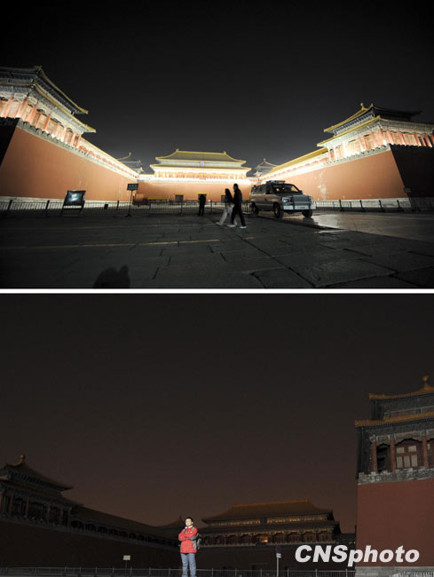 3月27日20時30分,北京故宮博物院與巴黎埃菲爾鐵塔、紐約帝國大廈、悉尼歌劇院等國際地標一起履行“地球一小時”的熄燈承諾關(guān)閉了景觀燈。圖為當(dāng)晚關(guān)燈前后的故宮午門廣場。中新社發(fā) 廖攀 攝