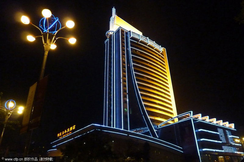 3月27日20時30分,四川省遂寧市明星康年大酒店準(zhǔn)時熄燈,與全球同步“地球一小時”,以實際行動推動這項目前世界上規(guī)模最大的環(huán)保行動。圖為酒店熄燈前的景觀。鐘敏/CFP