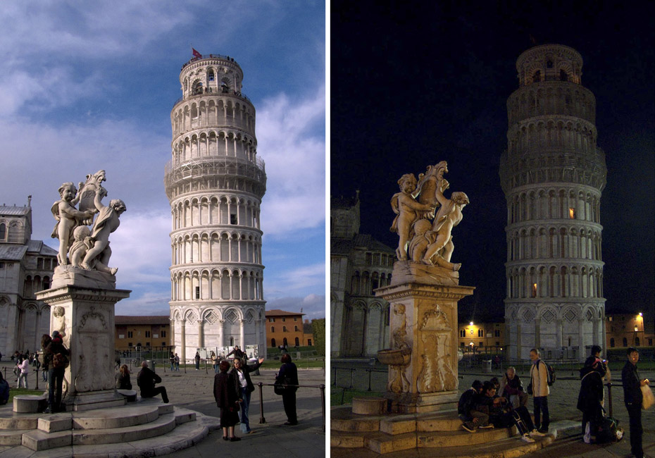 由世界自然基金會(huì)發(fā)起的“地球一小時(shí)”環(huán);顒(dòng)27日20點(diǎn)30分按照時(shí)區(qū)依次在全球數(shù)千個(gè)城市展開(kāi)。圖為意大利比薩斜塔在熄燈前和熄燈后的景色。