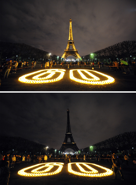 由世界自然基金會發(fā)起的“地球一小時”環(huán);顒27日20點30分按照時區(qū)依次在全球數(shù)千個城市展開。圖為法國巴黎埃菲爾鐵塔熄燈后和亮燈后的照片。