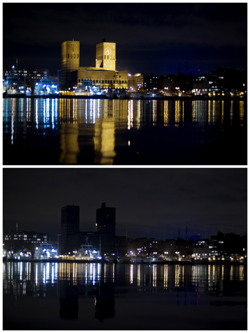 由世界自然基金會發(fā)起的“地球一小時”環(huán)保活動27日20點30分按照時區(qū)依次在全球數千個城市展開。圖為挪威奧斯陸市政廳在熄燈前和熄燈后的景色。