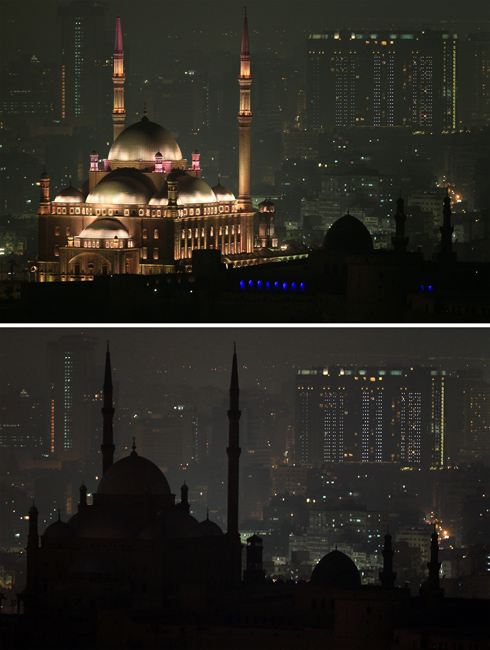 由世界自然基金會發(fā)起的“地球一小時(shí)”環(huán);顒27日20點(diǎn)30分按照時(shí)區(qū)依次在全球數(shù)千個(gè)城市展開。圖為埃及伊斯蘭教清真寺在熄燈前和熄燈后的景色。