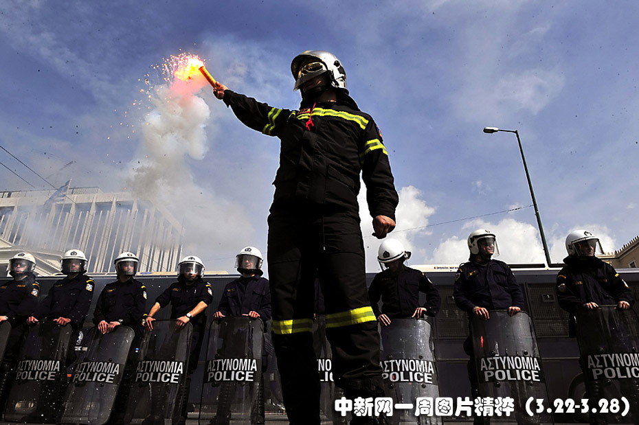 3月23日,在希臘雅典,警察封鎖了希臘國會(huì)的入口,一名抗議示威的消防隊(duì)員在一旁點(diǎn)燃了手中的燃燒棒。希臘政府表示,希望能在即將召開的歐盟首腦峰會(huì)上解決希臘的債務(wù)問題。