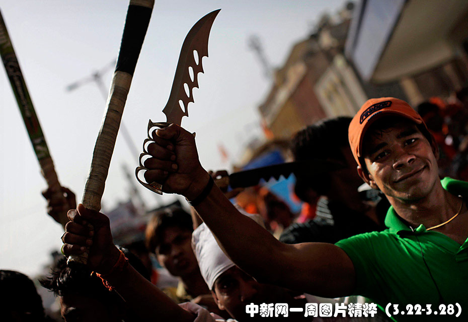 3月24日,在新德里的印度教教徒揮舞著刀子和棍棒游行,慶祝印度教節(jié)日。