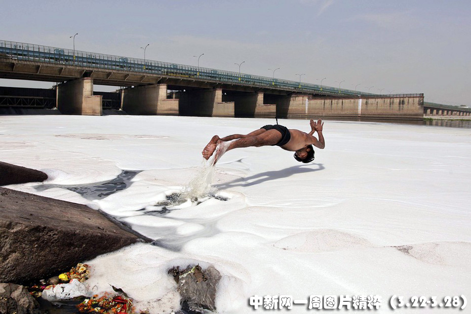 3月22日,新德里一名男子跳進遭到污染的亞穆納河。有關(guān)官員稱,工廠無視法規(guī)傾倒未經(jīng)處理的污水和工業(yè)廢水,使有毒物質(zhì)流入河水中。