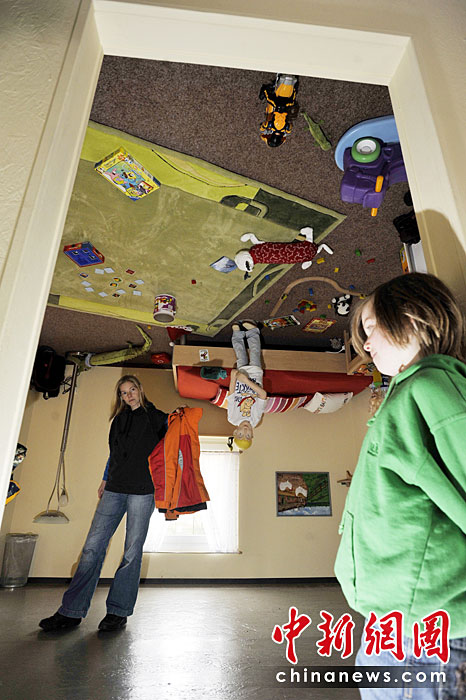 3月30日,德國蓋托夫市“瘋狂的房子”面向公眾開放。該房屋整個(gè)顛倒里面的家具也是被釘在屋頂上的。圖片來源:中國新聞網(wǎng)